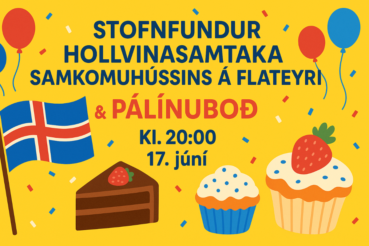 Því boðum við til hátíðlegs stofnfundar félagsins og fögnum jafnframt þeim frábæra anda sem ríkir á Flateyri, hristum saman hópinn og fögnum að sjálfsögðu þjóðhátíðardeginum í leiðinni!�Pálínuboð þar sem öll koma með eitthvað á hlaðborð, vinsamlegast takið með eigin disk og hnífapör (við eigum nefnilega eftir að uppfæra borðbúnaðinn í húsinu - það kemur að því!)