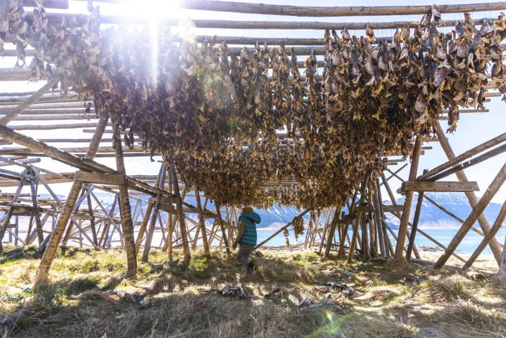 1. Outdoor Drying: Traditionally, harðfiskur is made by cleaning and gutting the fish (with the skin left on) and then hanging it outdoors to dry for four to six weeks. The fish fillets are soaked in a light brine, threaded with a hole at the tail, and hung on racks in breezy areas like here in the Westfjords. There, the crisp, clean air and dry climate work together to give harðfiskur its chewy texture and concentrated flavor.
