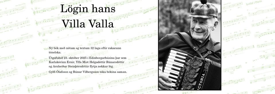 Þann 23. október kemur út ný nótnabók, Lögin hans Villa Valla, með 32 lögum eftir rakarann tónelska. Lögin eru flest birt með laglínu, hljómum og eftir atvikum texta, en önnur eru í útsetningum fyrir fleiri hljóðfæri. Þá eru nokkur lög prentuð í kórútsetningum. Mörg laganna eru áður óútgefin. Bókina prýða myndir frá löngum ferli Villa Valla og æviágrip.